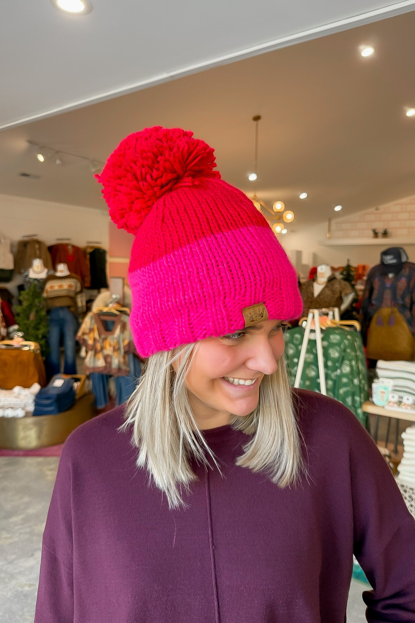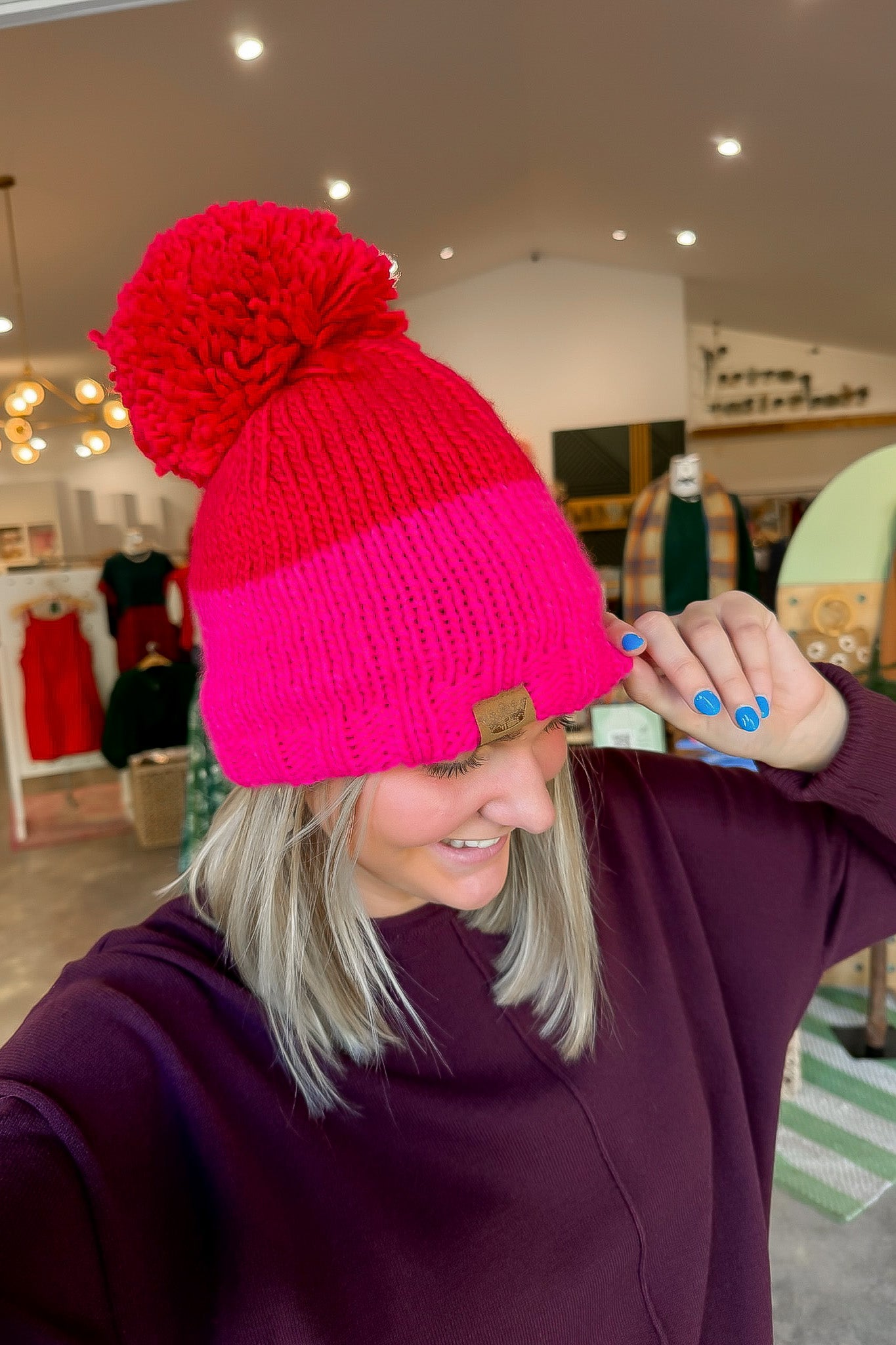 Red & Pink Pom Pom Beanie
